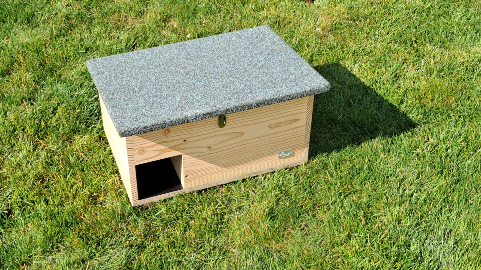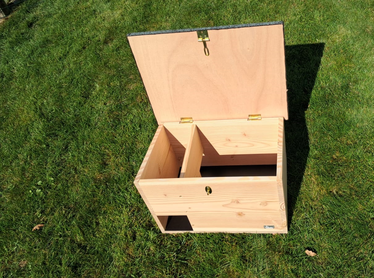 Für eine gute Luftzirkulation sorgen seitliche Belüftungsbohrungen, während das schräg konstruierte Dach mit überstehender Bitumenabdeckung das Innere zuverlässig vor Regen schützt.