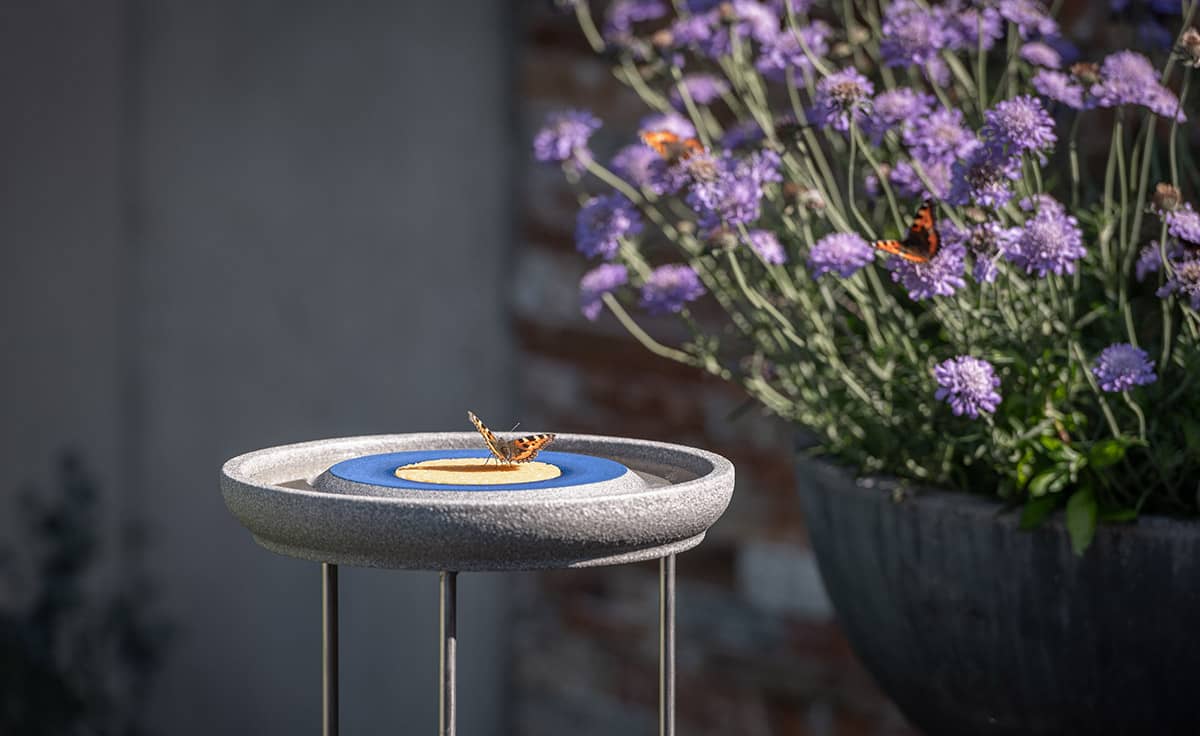 Unsere patentierte Insektenstation ist Tränke und Futterstelle in einem. Fluginsekten werden durch die blaue Bemalung angelockt. Der mitgelieferte Schwamm in der Mitte wird mit Sirup (z.B. verdünnter Fruchtsaft ) als Nektarersatz getränkt. Auf den inneren Rand kann Festfutter (z.B. Fruchtstücke) gelegt werden. Die umlaufende Wasserrinne dient als Tränke und schützt das Futter gleichzeitig vor Ameisen.